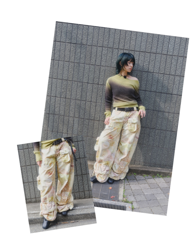 甘くなりがちな花柄をカーゴパンツでクールに昇華。色合いを揃えるのもポイント。