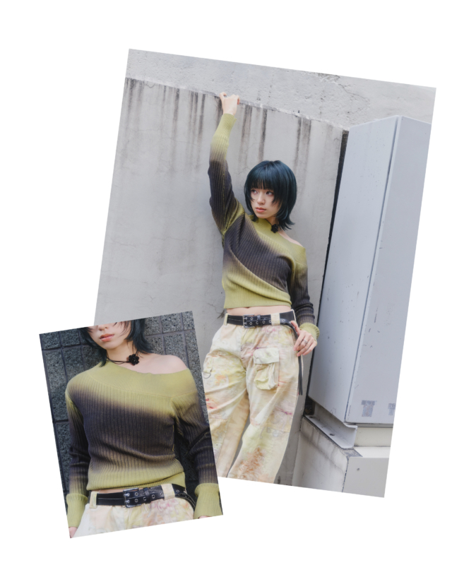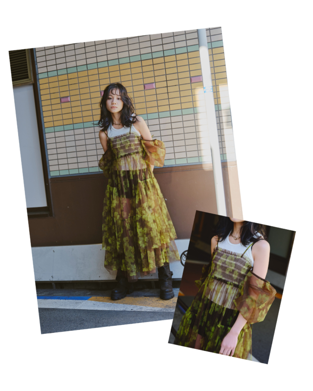 ミリタリーカラーと、オフショルダーのデザインが好コントラスト。