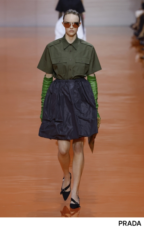 今季はタフな表情を持つミリタリーアイテムを、フェミニンな要素とミックスしたスタイルに注目!無骨さを中和するように、曲線的なラインやレイヤードを取り入れるのがポイント。プラダはカーキのシャツにフレアスカートを合わせ、女性らしいシルエットを描いている。落ち着いたカラーリングを基調に、コルセットやベストでメリハリを効かせたコーディネートが、大人の春夏ムードへと導いてくれる。サングラスやデザイン性の高いシューズで、遊び心もプラス。