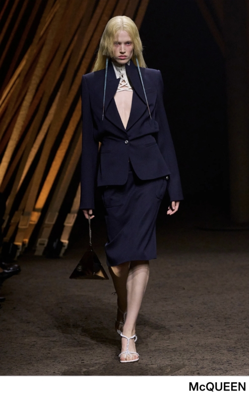 新たなスタートを迎える季節は、スーツスタイルを楽しみたくなるもの。マックイーンを筆頭に、知的さと内に秘めた強さを感じさせるスーツルックが今季は豊富に登場。ミディ丈のスカートに、ウエストを美しくマークしたシャープなシルエットが主流で、装いに凛とした緊張感をもたらすのが魅力。デザイン性のあるディテールが散りばめられた一着を選ぶことで、周囲と差のつく洗練されたスタイルが完成する。ベルトやバッグ、靴で個性を効かせて。