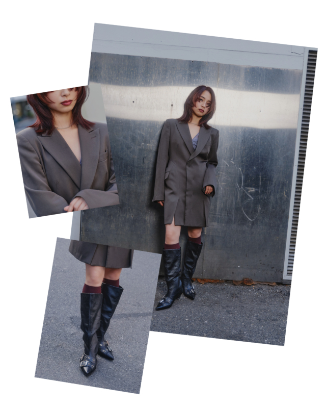 胸元をすっきり見せることで、程良い抜け感と色気を演出。足元はポインテッド・ブーツを合わせて、都会的なエレガントさと強さをプラス。