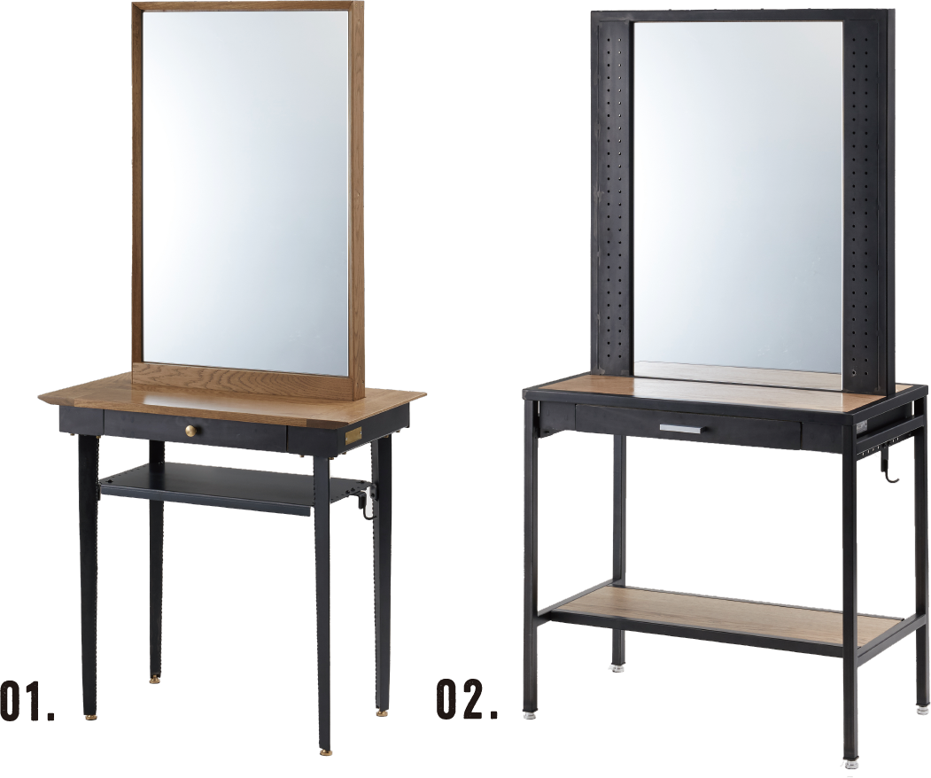 ブルックリンスタイルを追求した、直線的なラインが特徴のウッドベースの自立式ミラー「01」。スライドテーブル、ドライヤーフック付き。