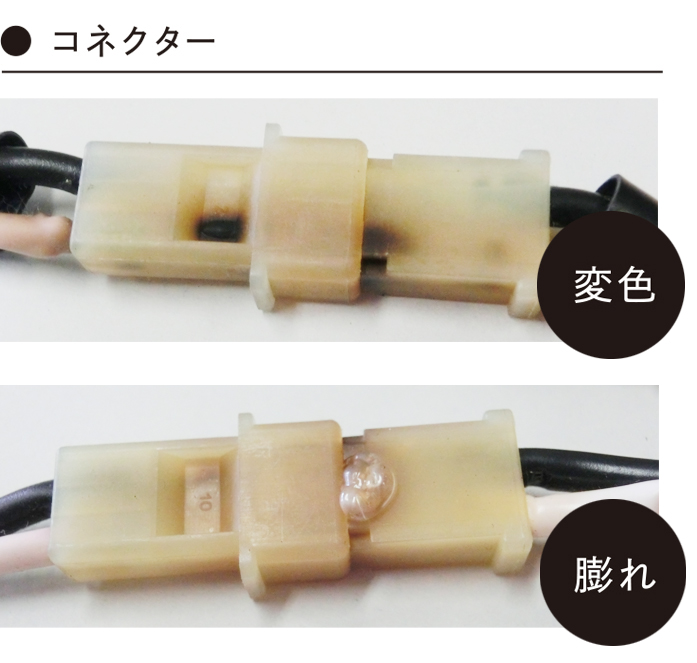 ④写真Bの赤丸部に現れるコネクターの変色・膨れがないか確認する