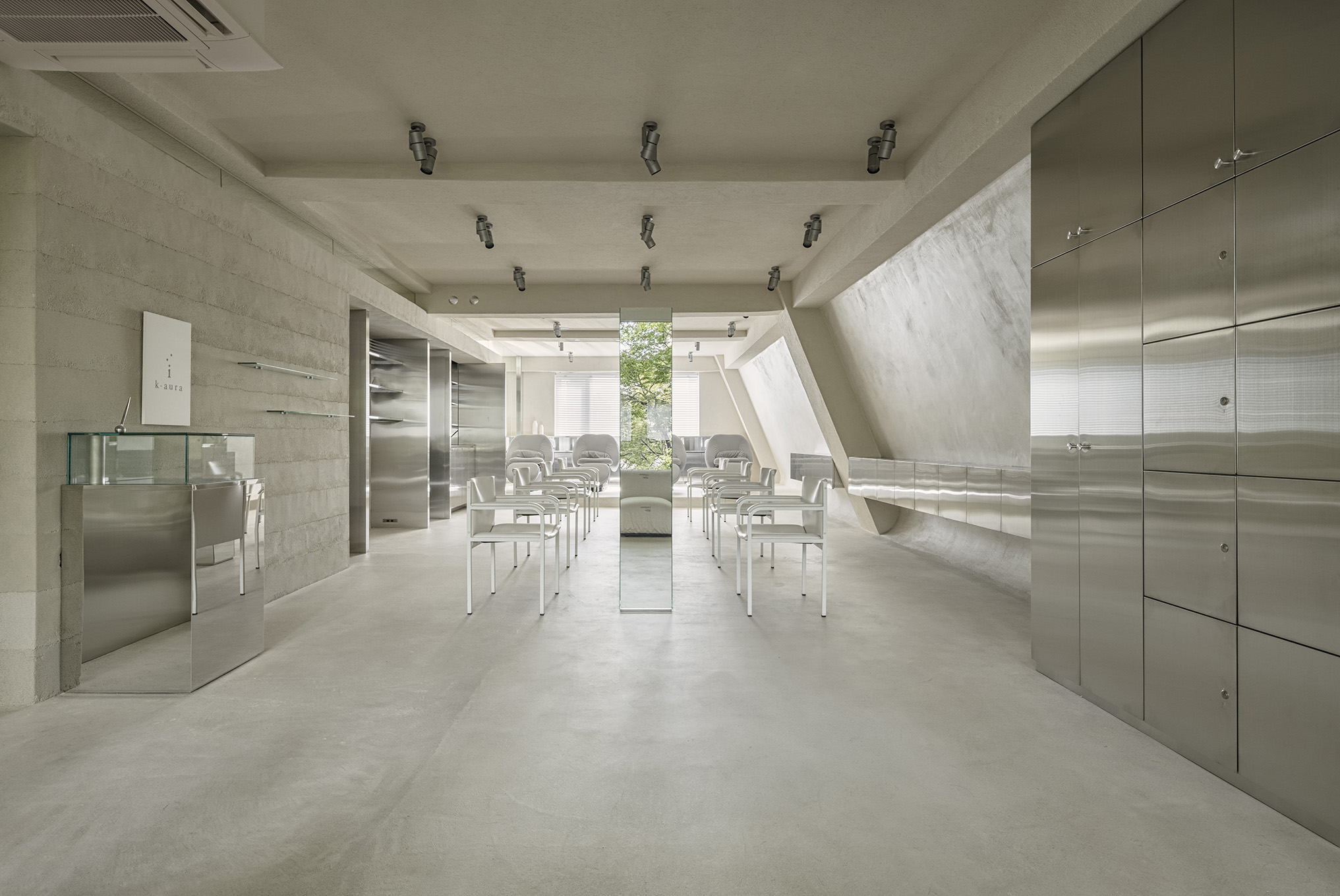 都内と千葉県内に複数店舗を展開するサロンの支店。美容室らしさにとらわれず、かつ普遍性を持つデザインが求められた。機能面としては、セット面を3列に分けて回遊動線を確保。1列はメイクにも対応し、スクリーンで仕切ると着付けや練習ができる空間に。残る2列は入社式などのイベントにも対応でき、さらに鏡の効果による拡がりを加えた。細部では、梁の両脇に設けた凹みにライン照明を隠し、屋根の隙間から漏れ入る光として表現。陰影と質感、見え隠れ、多様な場、ほど良い一体感などの視点からトーンを整え、落ち着きや品が感じれられる居心地の良い空間をデザインした。