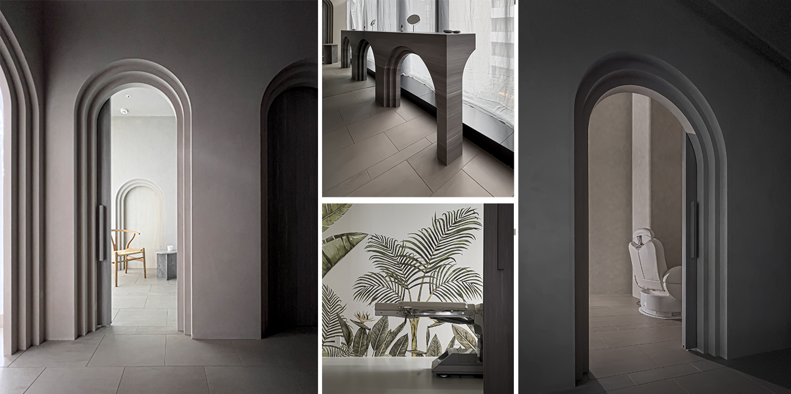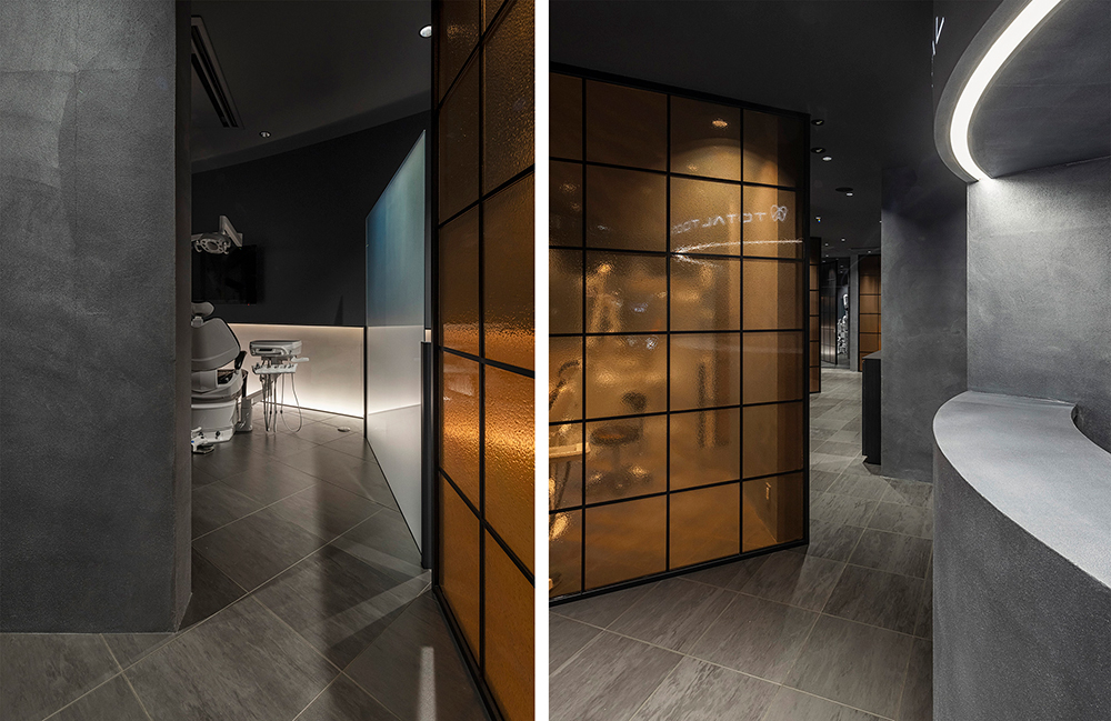 非日常空間を意識し、入り口からセット面へのアプローチにフォーカス。建物の構造上存在する幅2mの細長い空間にカウンターを配置し、受付・店販・展示スペースとしての機能を設けた。この空間の天井を下げ、照明を入れることで「光のトンネル」とし、ゲストはここをくぐることで奥のプライベート空間へと気持ちを切り替えながら進んでいくことができる。白く抽象的な「トンネル」とは対照的に、セット面やシャンプースペースには木目を使用し、温かみのある空間とした。