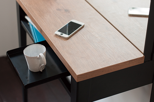 引き出し式のテーブルなので、お客さまの手の届く位置にマグカップや携帯電話を置いていただけます。