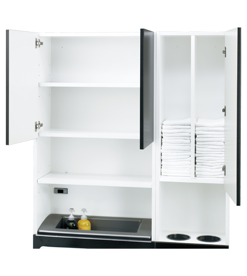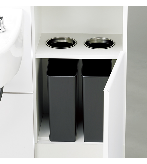 収納とバランスの良い使い勝手。美しい佇まいでサロンに自然に溶け込みます。必要十分な機能を盛り込んだシャンプーボウル「マジョリカポルト」専用のキャビネットです。