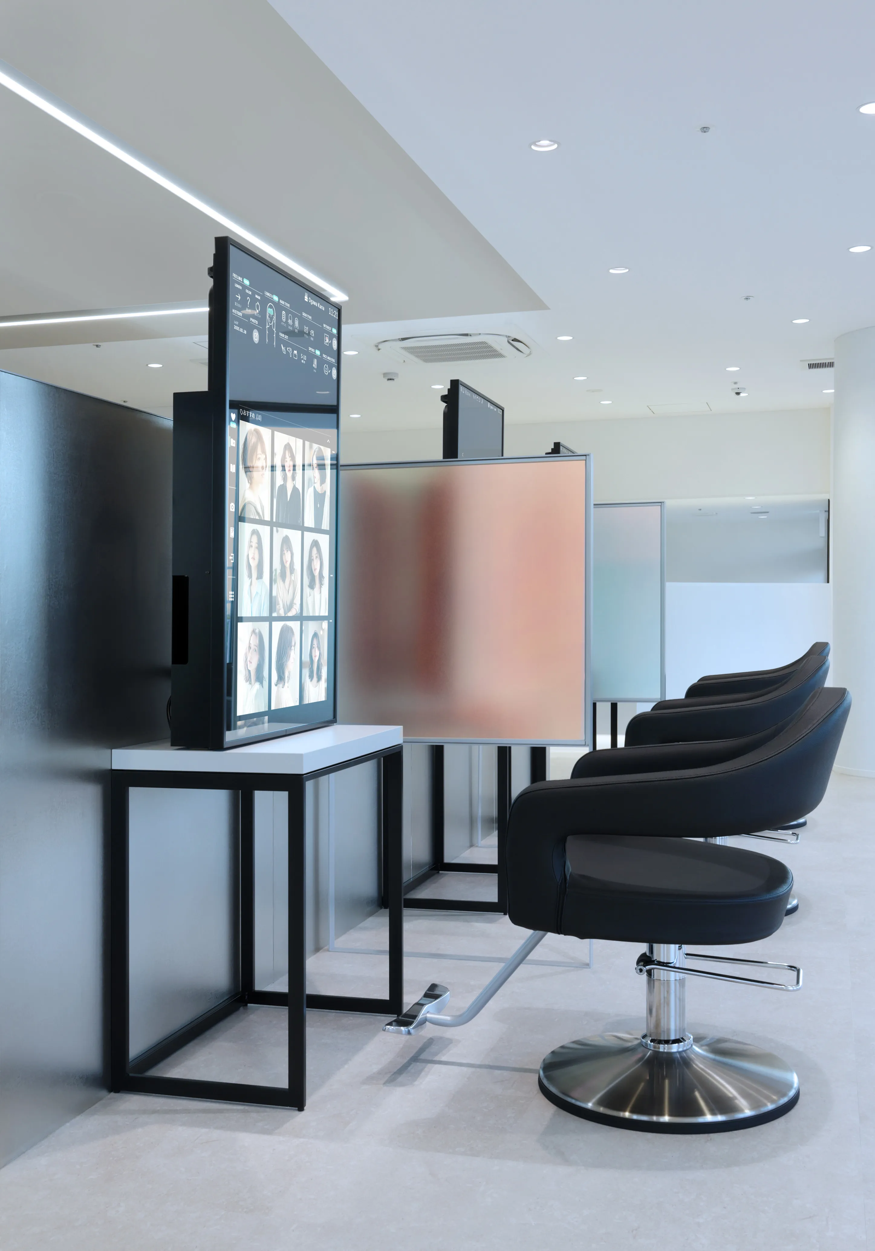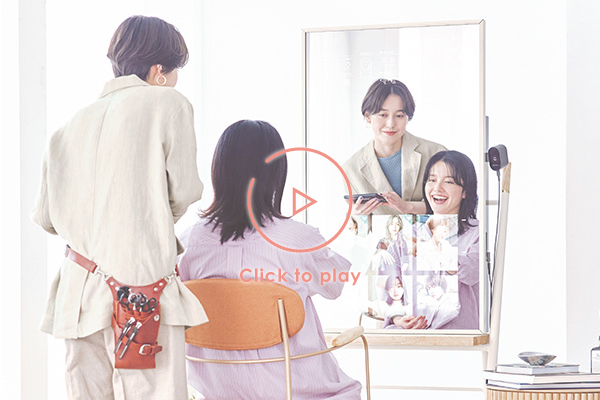 ミラー上に画像や動画を映し出し、来店中のコミュニケーションをサポートするスマートデバイスミラー。ミラーを通じて操作・紹介した内容は、カルテやお客様マイページに自動的に連携し、業務効率化にも繋がります。 -