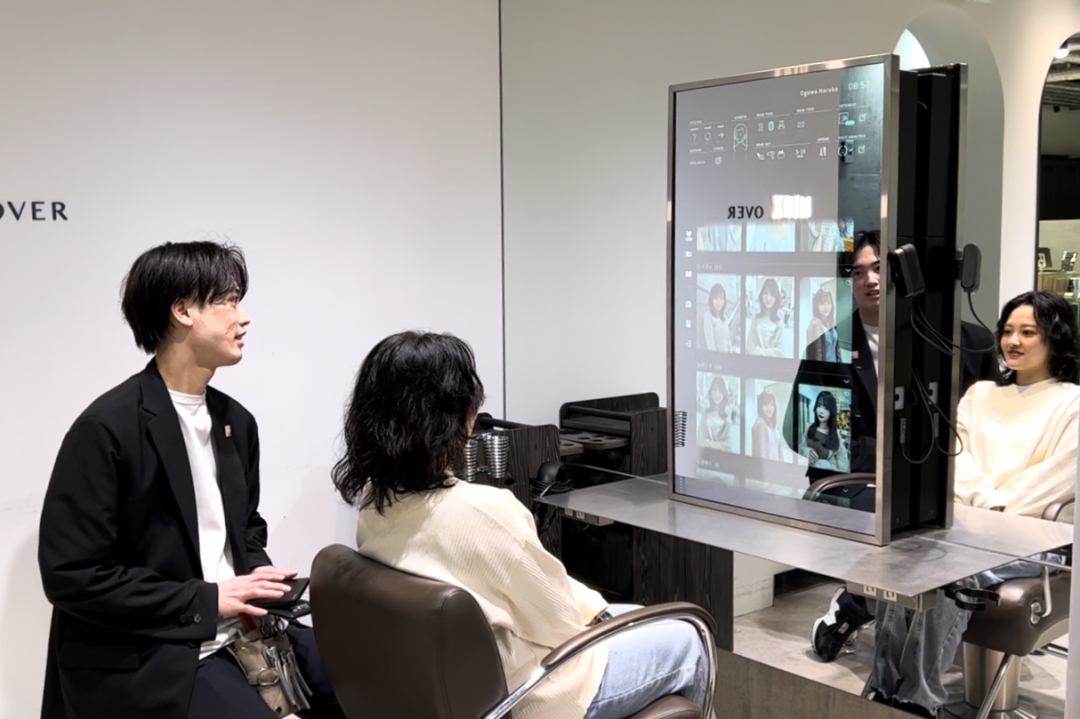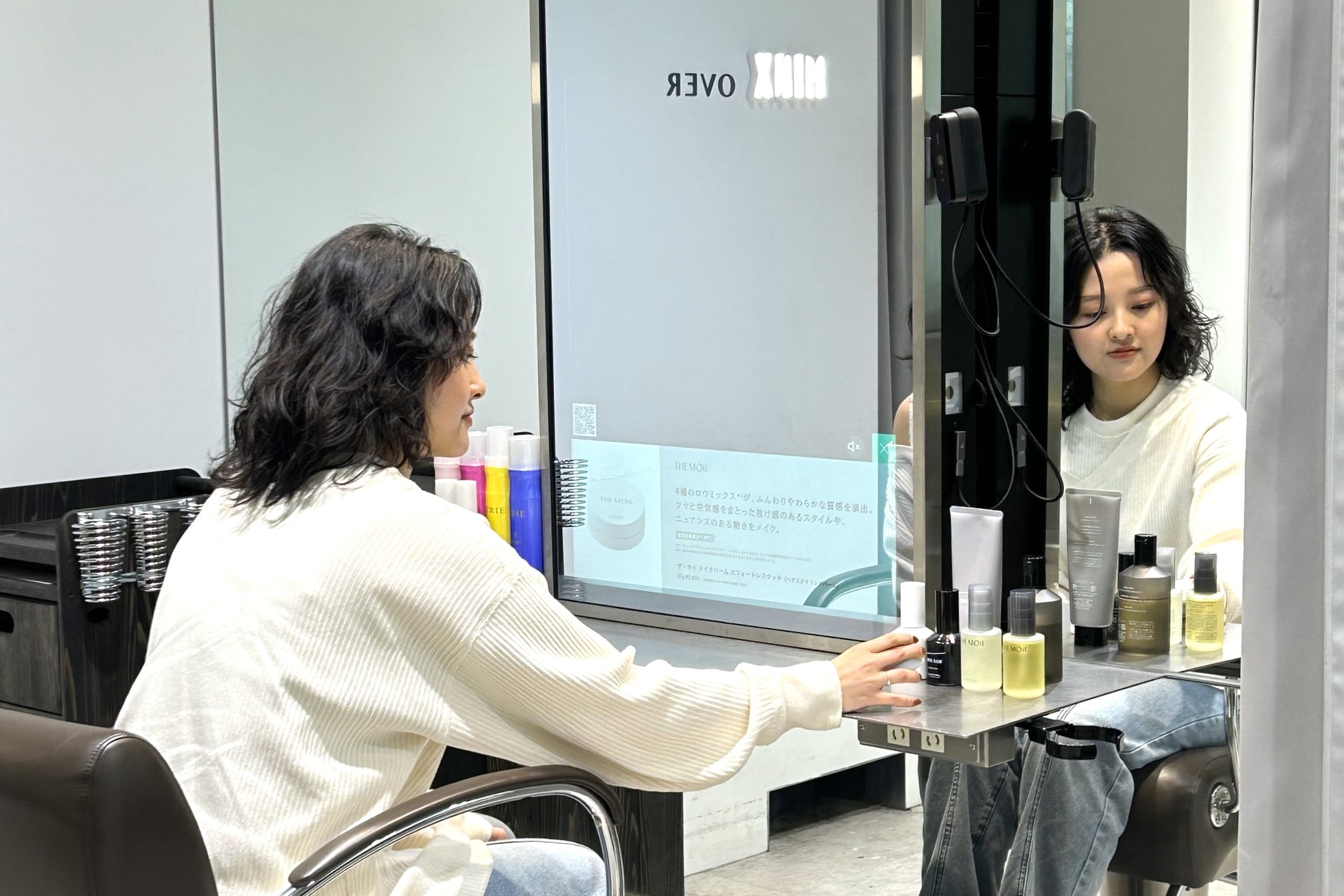 「事前に答えてもらったアンケート結果が鏡の上部に表示されることでお客様と会話をする前からなりたいイメージやお悩みが分かるので、商品アプローチの戦略が立てやすくなりました。カラー剤の塗布中や放置中にお悩みにフィットした商品のバナーを流しておけば自然と目に入って『この商品って何ですか?』とお客様から商品の話題になるんです。一方的な提案ではなく、あくまでお客様の関心から会話がはじまるので、購入にもつながりやすいですね」