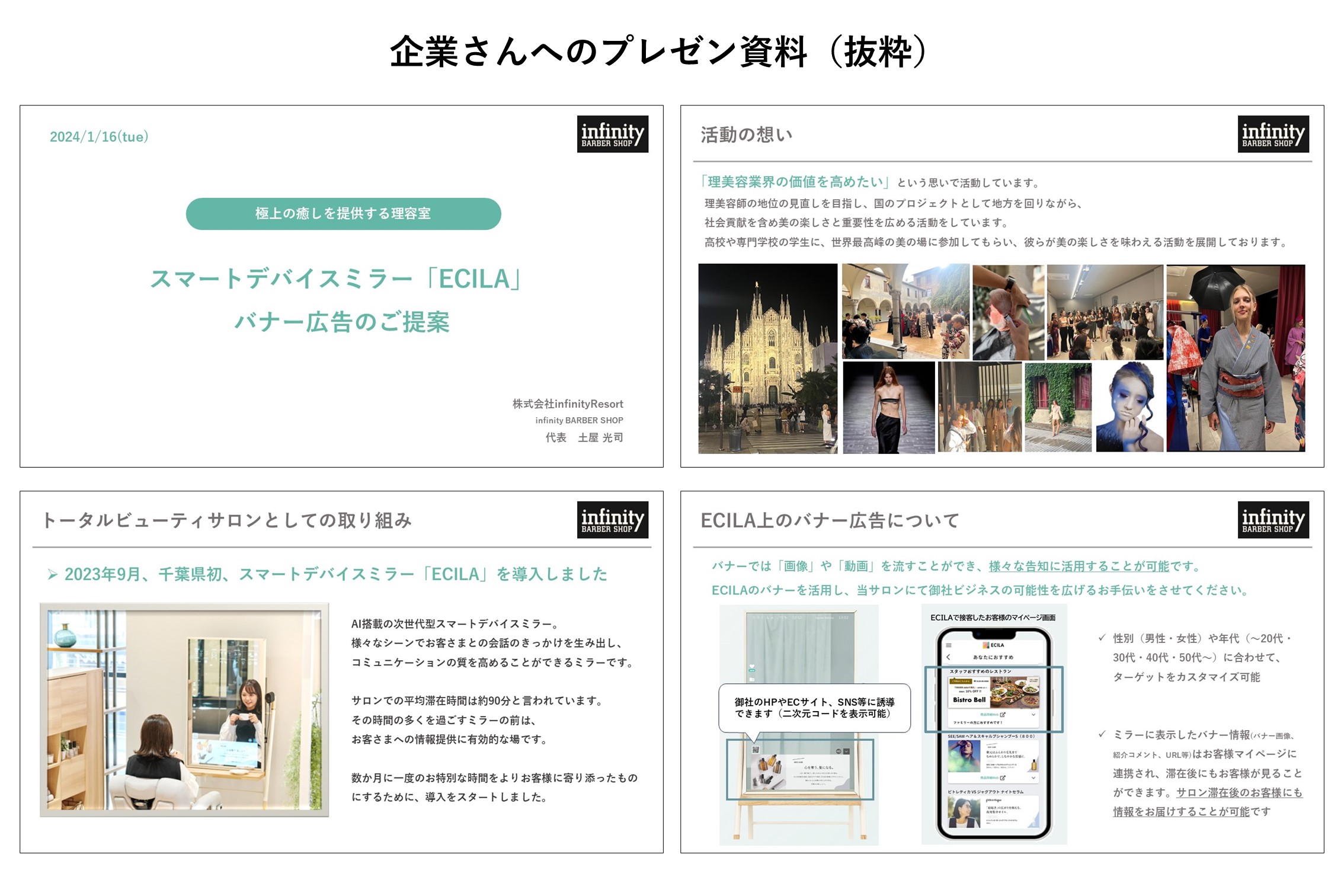 次は、広告を流してくれる企業さんを募るためのプレゼン資料づくり。新規来店者数や来店されるお客さま層など、サロン情報を精査してinfinity BARBER SHOPで広告を流すメリットをしっかり説明できるように試行錯誤した。