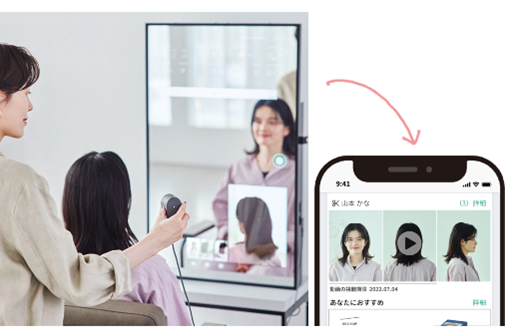 ミラーで撮影した写真が自動的に連携。これまでサロンにしか残らなかった記録をお客様自身でも振り返ることができ、次のスタイルを考える参考になります。