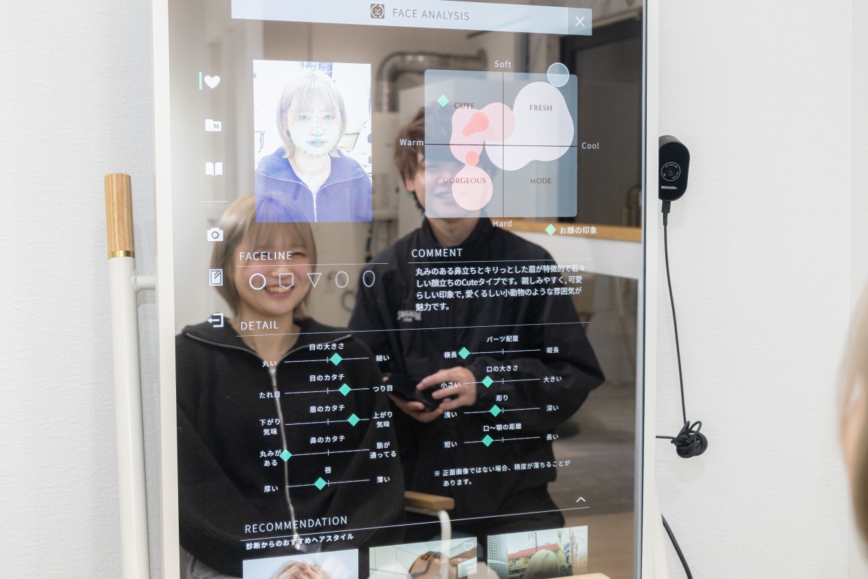 お顔を撮影し、パーツの配置や彫の深さなどを計算。データをもとに、AIが似合うスタイルをレコメンドします。さらに、そのスタイルにお客さまのお顔を合成することもできます。