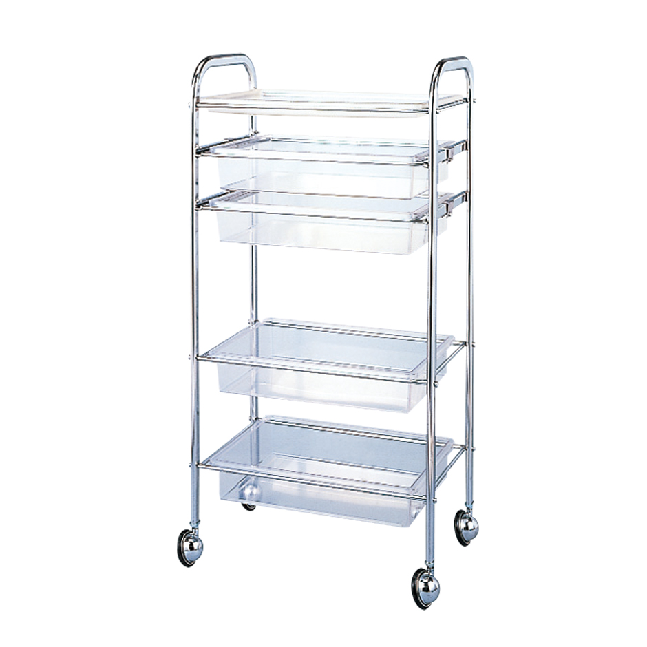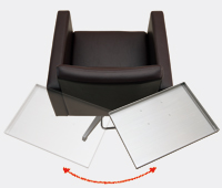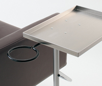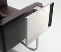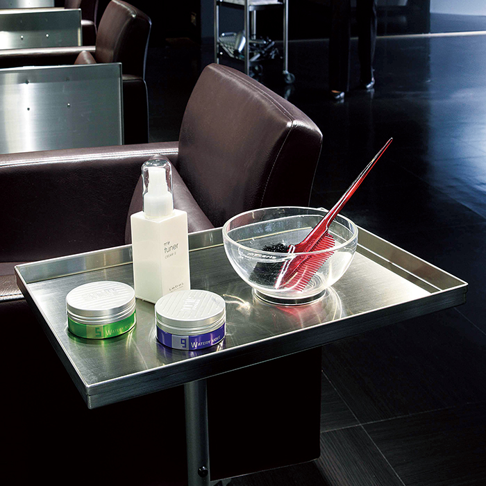 スタイリングチェアに取り付けられる、施術者用トレイ。回転するので、様々なシーンやメニューで使用できます。使わない時には折りたたみ収納ができ、省スペース化を実現。