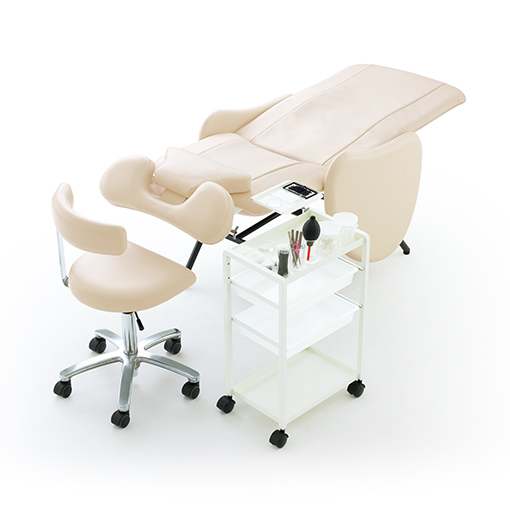 エクステンションやグルーなどを手元に置ける、回転、昇降機能付きのアシストトレイを搭載。施術中の無駄な動きが少なくなり、作業効率がアップします。下段には商材を収納できる引き出し式トレイ付き。