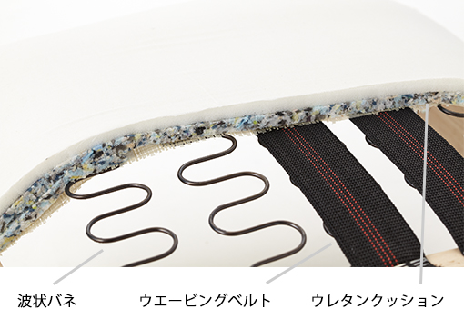 座面には高級ソファにも使用される波形バネ(S字バネ)を用い、適度な弾力性を持ちながら座面全体が沈み、身体をしっかりと支えます。この波形バネは耐久性が非常に高いため、サロン環境下においても座り心地が大きく変わることなく長期間ご使用いただけます。また表面にはソフトに体圧を包み受けとるウレタンクッションを使用し、バネとの組み合わせでソフトでありながら安定感のある座り心地を実現しました。さらに、背面には二つの機構に加え、腰の部分にしなやかな弾力が特長のウェービングベルトを採用。腰の部分を強く支え、リクライニング状態でも寝姿勢をしっかりと保ちます。