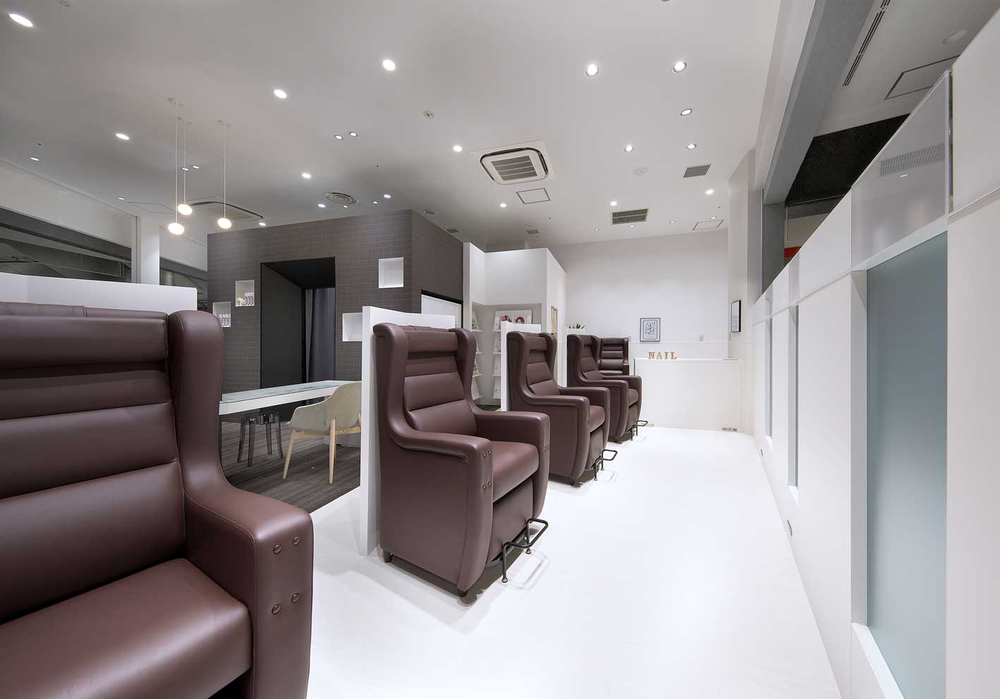「お客様も技術者もより快適」を目指したネイルチェア。リクライニング機能の無い、ハンドとフットネイルに特化したチェア。快適性にこだわったソファのような座り心地。