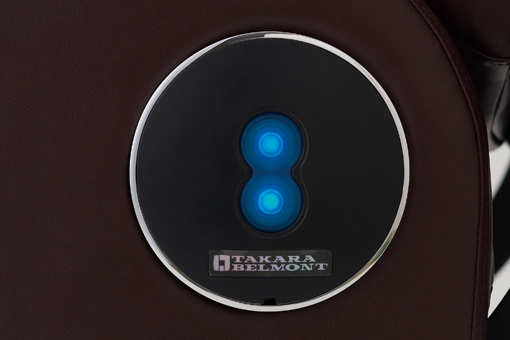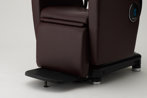 座った状態からワンタッチでシャンプー姿勢へ移行できるフットスイッチ。手すりに配置したお客さまの体格差によって位置を調整できる微調整用マニュアルスイッチは、ブルーの光が美しく、インテリアのアクセントにもなります。