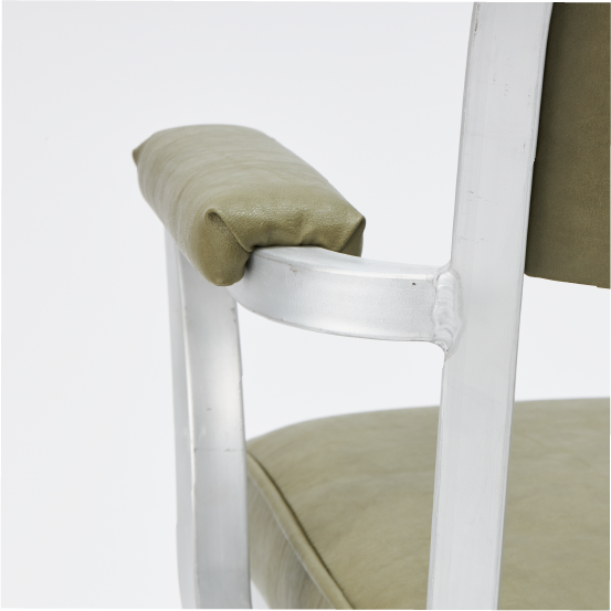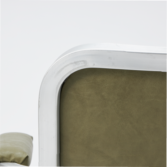 ミニマルなフォルムと無機質なアルミの縁取りが存在感を放つアメリカンダイナーを想起させるモデル。あえて加工時の傷や溶接跡を残したフレームとヴィンテージ感のある張り地が、クラシカルでクールな印象に。