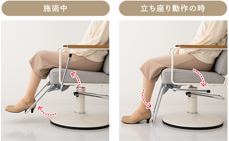 簡単なレバー操作でステップがチェアベース側に移動し、普通の椅子に近い形で立ち座りいただけます。