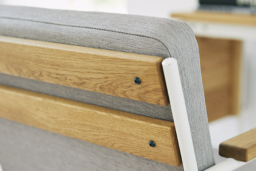 シンプルなクッションとフレーム、木材を組み合わせたニュートラルなモデル。どの角度からも覗くホワイトフレームとオーク材、淡いパウダーカラーが、クールな印象を与えます。
