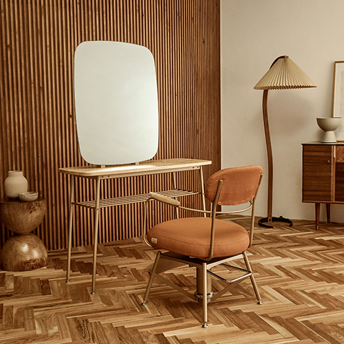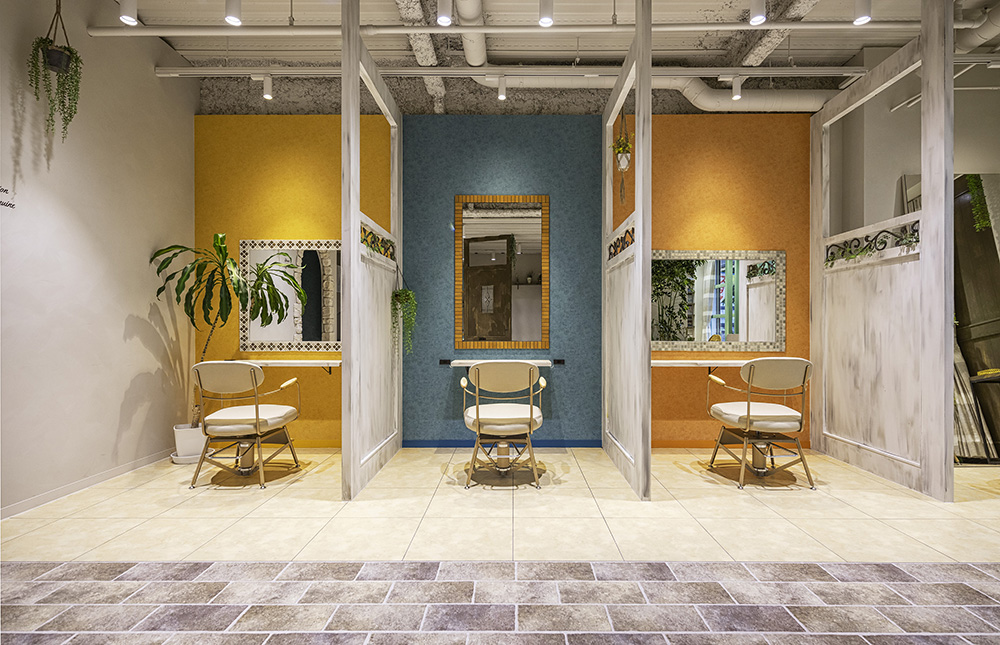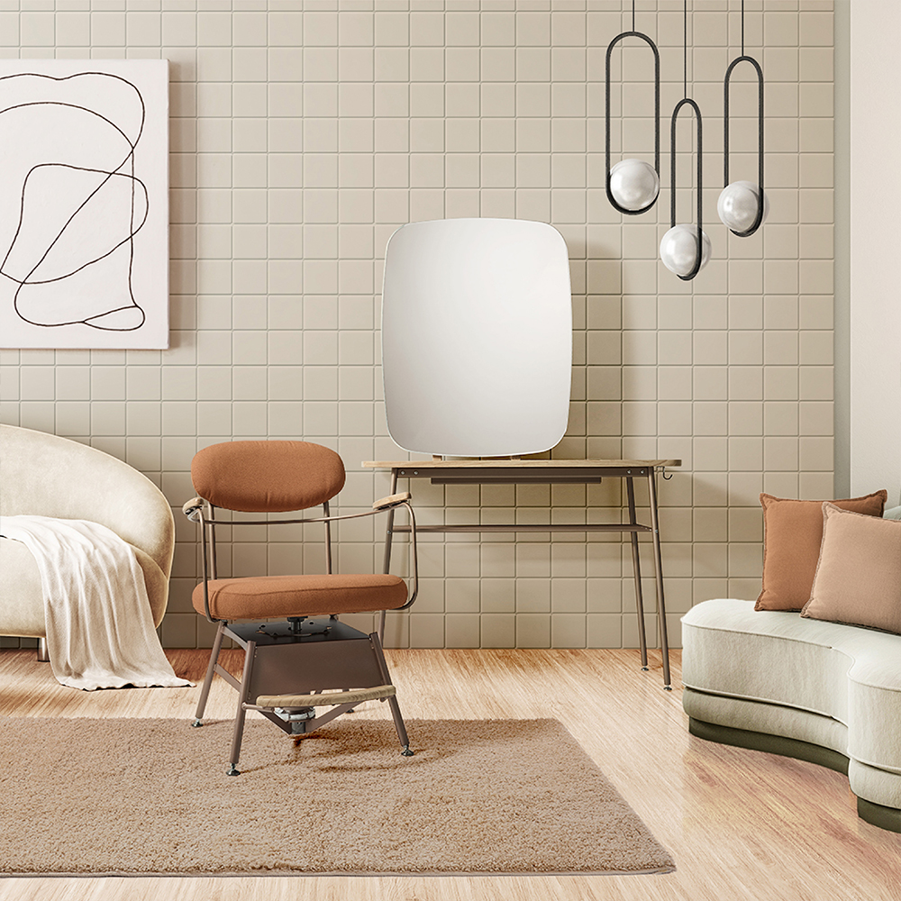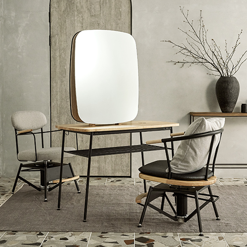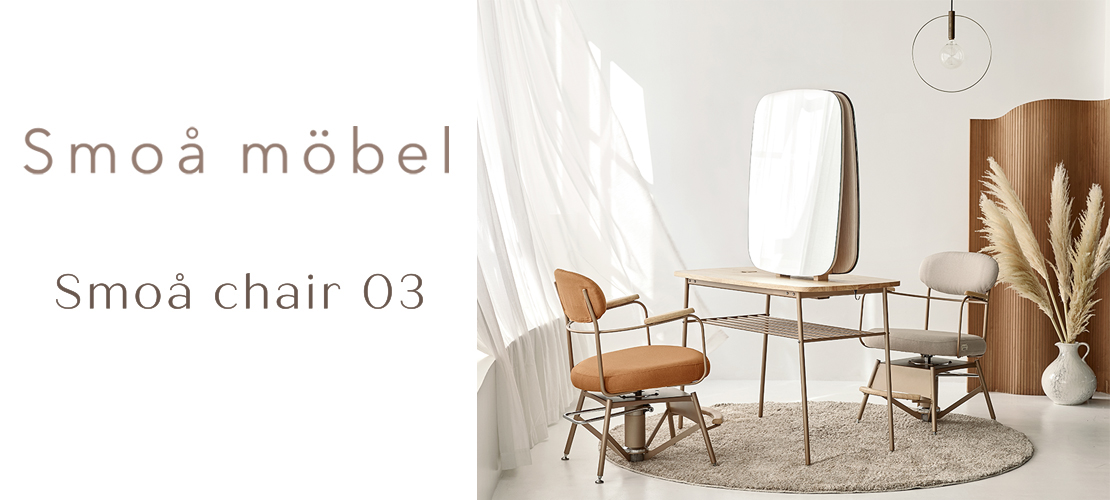 ここまで細く華奢なフレームの美容椅子は、新しさを感じる大きな要素に。背もたれや手すりも必要最低限に絞り、アート的に、かわいらしい印象と抜け感を大切にデザインしました。