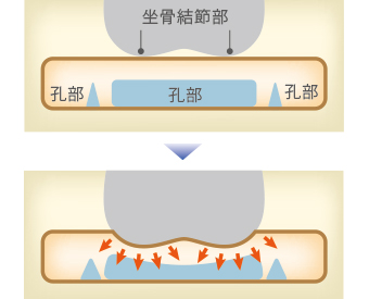 腰掛けた時に最も座圧が掛かる部分(坐骨結節部)の圧力が分散するよう、シートに形状の異なる複数の孔構造を設けました。これにより、クッションが体に沿って変形し、長時間でも快適に過ごしていただける座り心地を生み出します。