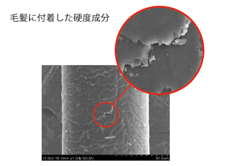 硬度成分が毛髪に付着すると、毛髪が絡みやすくなり、クシどおりが悪くなったり、仕上がりの質感にも影響を与えます。