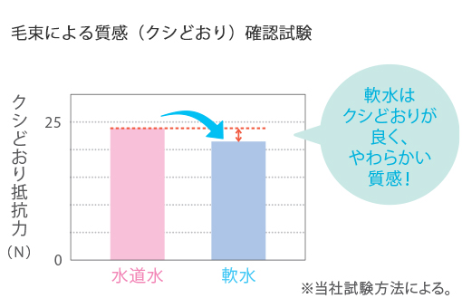 シャンプーの泡立ちがよく、洗浄効果を高め、髪や頭皮にやさしい水に含まれる硬度成分は、シャンプー剤の洗浄成分(界面活性剤)に対して、泡立ち効果を損なうなど、洗浄効果に影響を与えます。泡立ちが不充分な状態では、毛髪同士が擦れやすくなるため、毛髪や頭皮をいためることがあります。