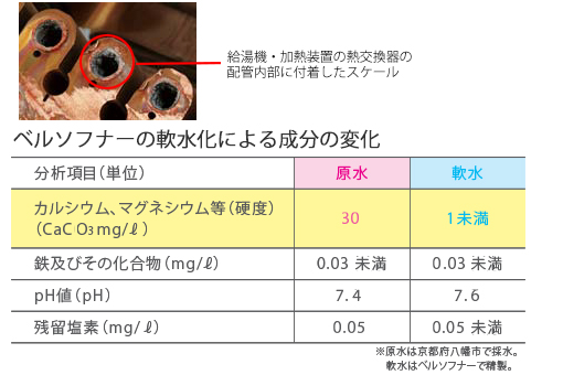 給湯機やシャンプー機器だけでなく、スチーマー等の水を使う促進機にとって、硬度成分は大敵です。使い続けるうちにスケールとなって、機器配管等に付着し、性能の低下や故障の原因となります。