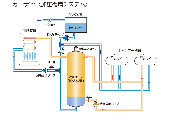 たくさんのシャンプー台で同時・連続出湯が要求される大規模サロンに対応できる給水および貯湯タンクを採用。