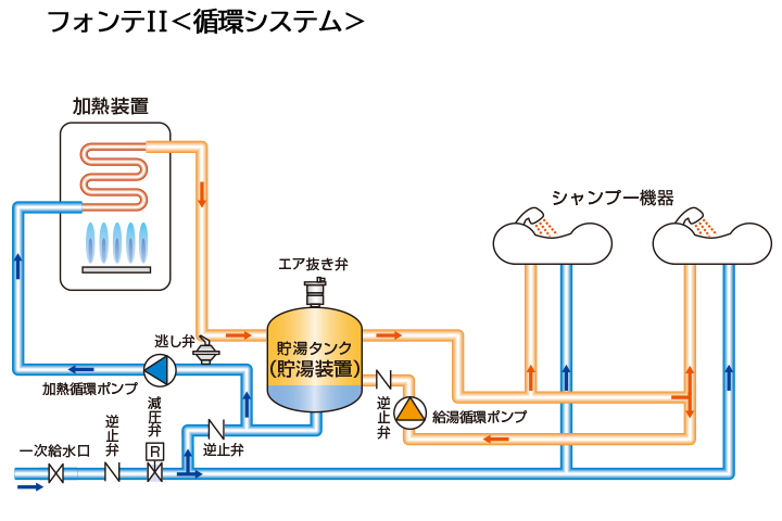 シャンプー台と貯湯装置の間でお湯が循環しているので、捨て水も少なく即時出湯できます。