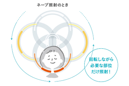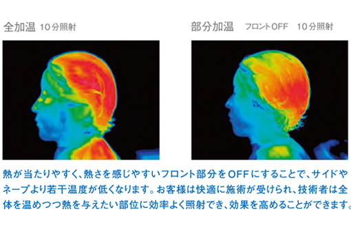 カラー、パーマ、トリートメントのモード使用時は、ローラーボール独自の赤外線サーモセンサーが頭部頭髪温度を直接感知し、つねに設定された温度レベルを保ちます。さらに、照射中に居眠りして頭の位置がずれたり、異常な温度上昇などにより、 設定外の温度を感知するとエラー音が鳴ります。また、異常な温度上昇を感知した場合は、安心のために自動的に運転も停止します。