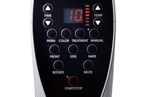 離れた位置からでも動作状態が確認できるようコントロールパネルを配置し、視認性を高めました。パーマ、カラー、トリートメント、マニュアルの4種類の施術モードや、フロント、サイド、ネープの3種類の照射部位の選択も、各ボタンを押すだけで簡単に設定できます。また、本体背面のパイロットランプがブルーに点灯(運転中)、点滅(運転終了等)して、運転状況をお知らせします。
