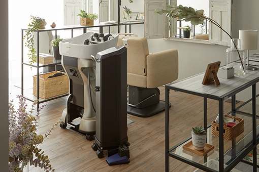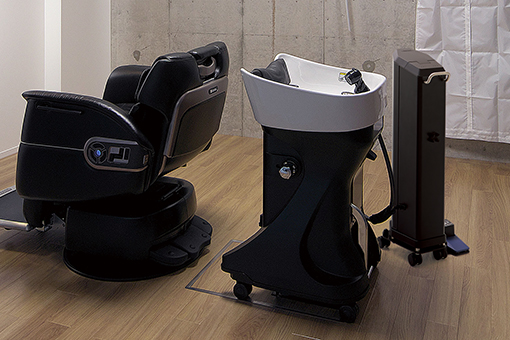 キャスター付きで移動可能。工事も不要です。シャンプー機器へ簡単に接続できます。