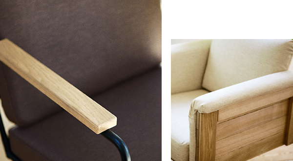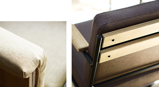 シンプルなクッションとフレーム、木材を組み合わせたニュートラルなモデル。手すりと背もたれには厳選したオーク材を使用し、触るたびに経年変化を楽しめる仕上げを行っています。どんな空間にもしっくりと馴染む、癖のない佇まいです。 -