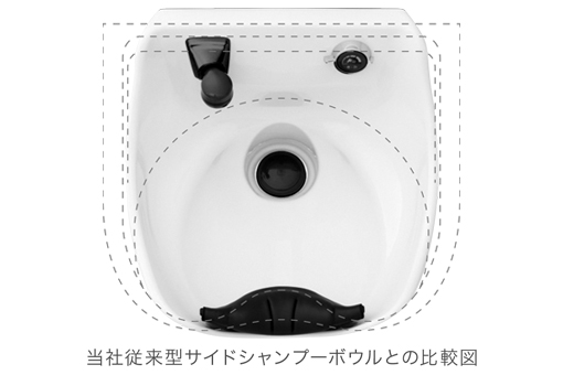 施術に必要なボウル幅(内寸)はそのままに、ボウルのサイドラインをシャープにし、よりお客さまに近いポジションで施術できるようにしました。反対側の耳裏もラクに洗えます。