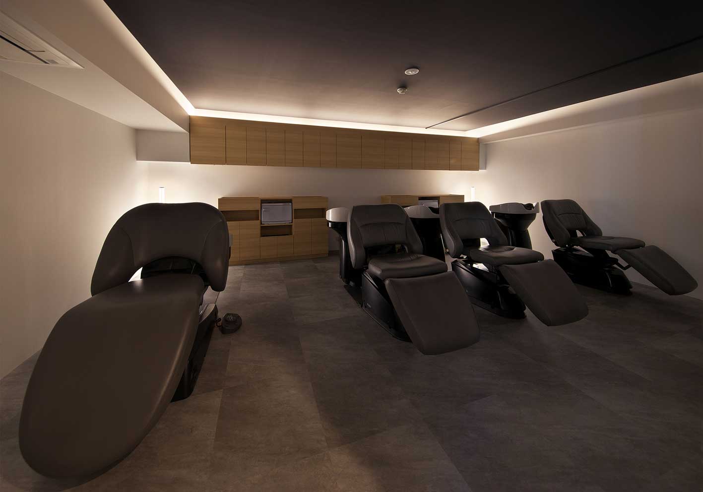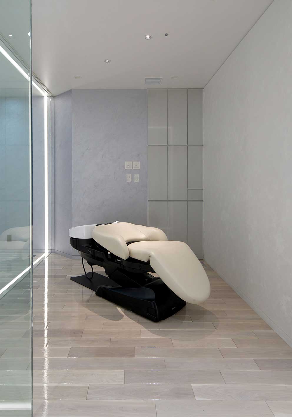 シートを回転させ、ヘッドレストを装着するチェアスタイルにより、マッサージメニューも容易にできます。照明やアロマにも配慮して、サロン独自のメニュー提案を。レッグレストは自在に角度調整できるので、お客様に合わせて、より快適なリラクゼーションが提供できます。
