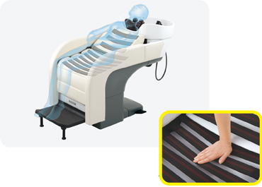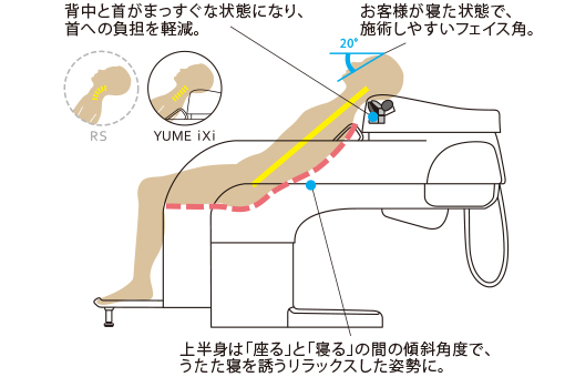 からだをやさしく包み込むシートに寝そべるようにくつろぐ姿勢は、文字どおり“うたた寝”を誘うここちよさ。その上で、サロンの規模を選ばない「省スペース性」とシャンプー時の「施術のしやすさ」を実現しました。お客様にもサロンにもうれしい新たなYUMEのスタイルです。 -