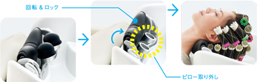 ネッククッションは手前に起こすことができ、ロックが可能に。ヘッドピローを取り外せば、ロッドに干渉しない空間がうまれ、中間水洗がよりスムーズにできます。 -