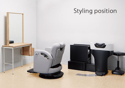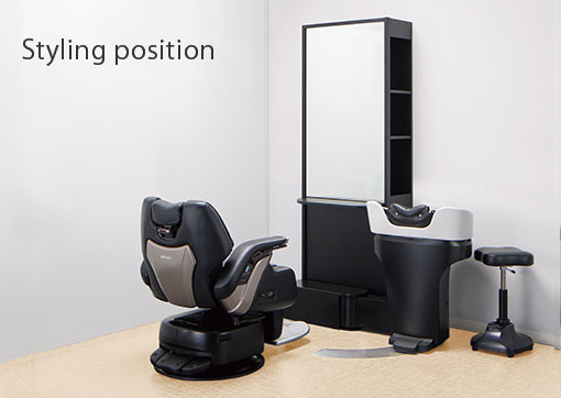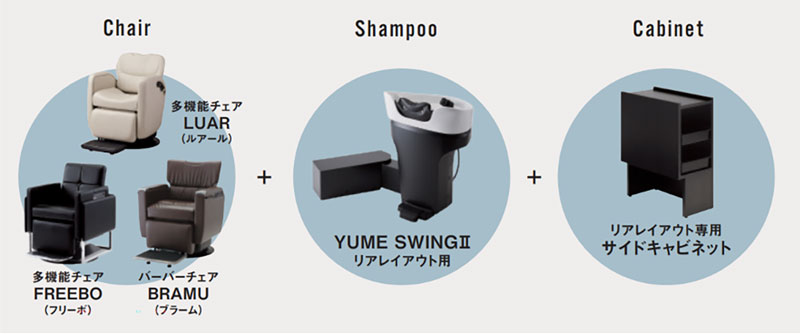 YUME SWINGⅡはお客様の背後に置くので、ミラーを含めたセット面の内装デザインは自由。専用のサイドキャビネットは収納力に優れ、YUME SWINGⅡの設置条件に合わせ配管を隠すことも可能です。チェアは美容・理容共通のLUAR、または理容サロン向けのBRAMUをオススメします。
