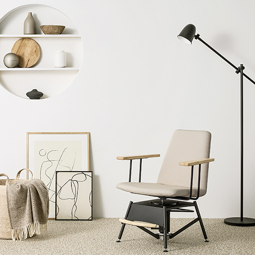 ステップをチェアベース側の控えた位置に設けることで、乗り降りの際に邪魔になりません。更に座面高も通常より低く設定し、床に足を着けたまま落ち着いて座ることが出来ます。