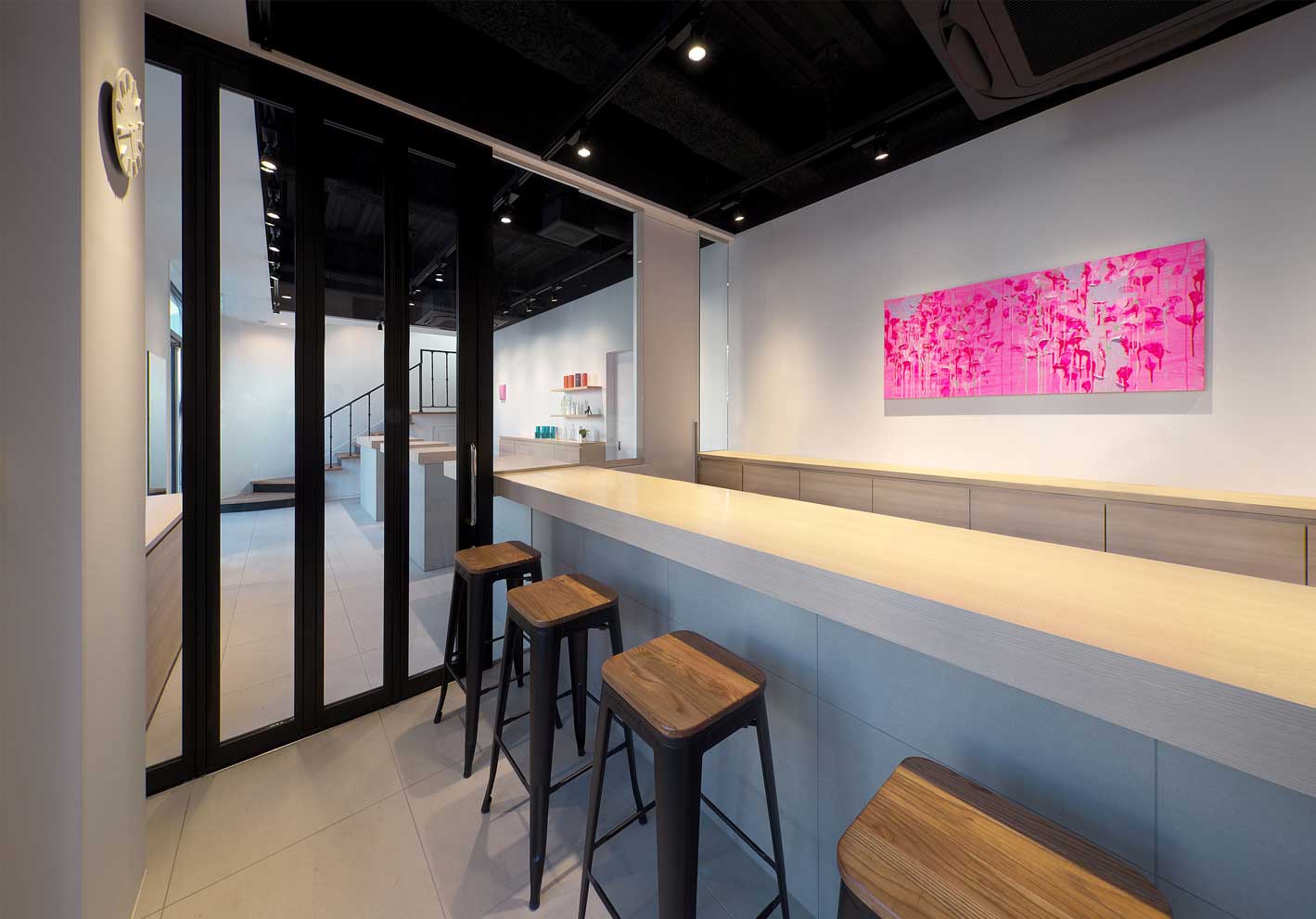 理美容とカフェの併設の為、隔壁を作る必要があるが、繋がりのあるデザインにしたい・・・そのため隔壁をガラスで仕切り、理美容の受付・ディスプレイのカウンターとカフェのカウンターを同じデザインで繋げたように見せる事で一体感を演出。