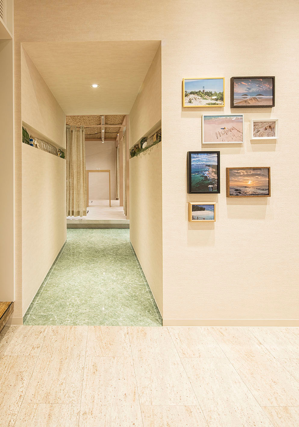 FCオーナーの2店舗ということで数年先を想定した美容室。島国のリゾート地をイメージ。砂浜(受付待合)から海のコテージ(施術スペース)へ向かうようなストーリーを浮かべながらレイアウトをしました。訪れた人が真っ先に必ず通るトンネルの向こうにはサロンで高単価を獲得していく多目的スペースを海を浮かべるように配置。必ず目にとどまることでお客様の記憶に残す。
