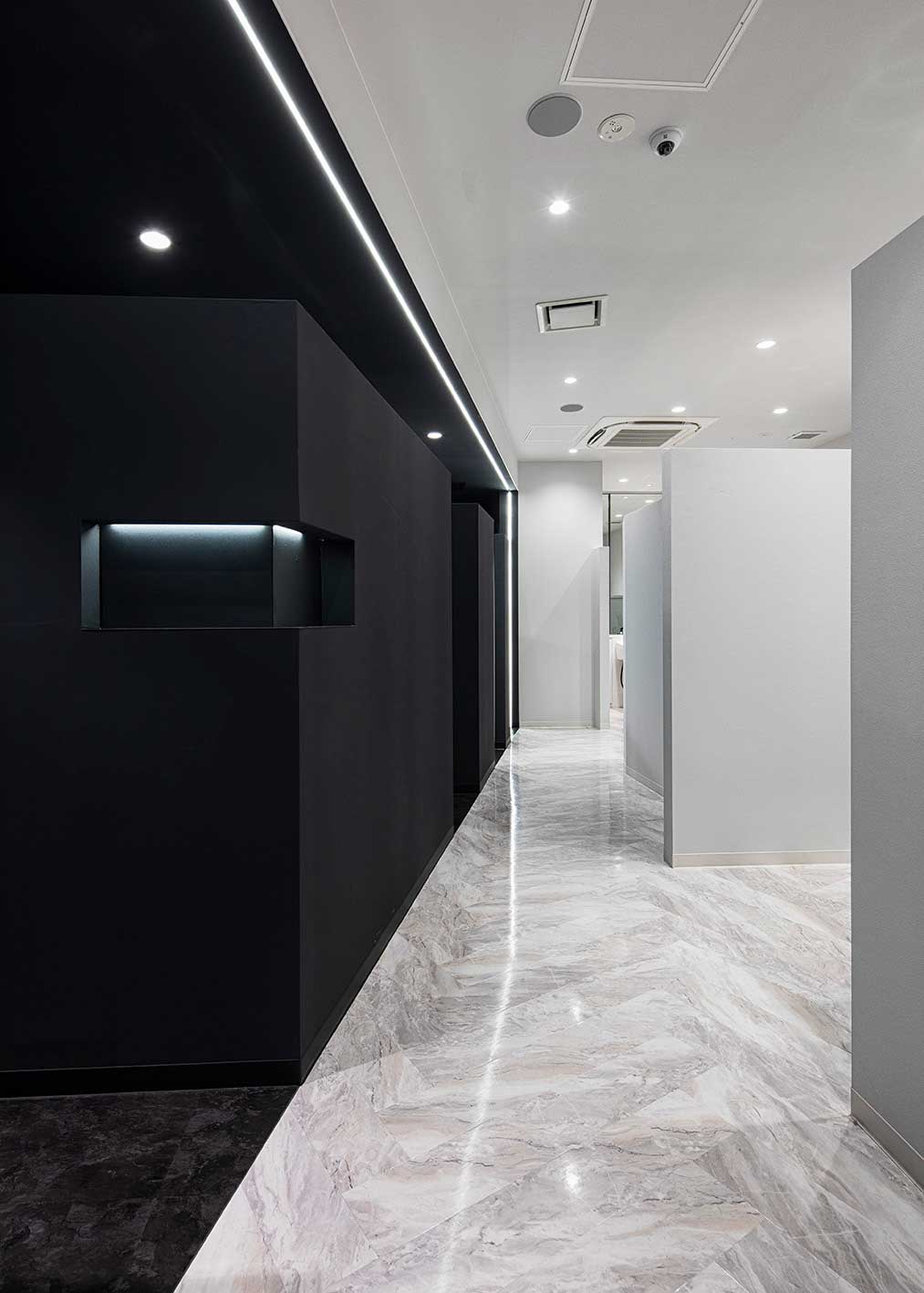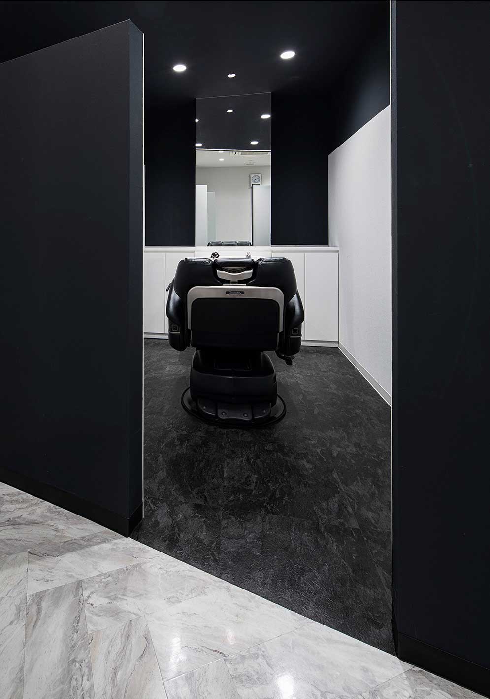 平面構成には、鋭利な剃刀を彷彿とさせる斜線を意図的に多く取り入れた。アイキャッチになるライン照明は黒い空間を強調させ、サロンのアイコンになっている。