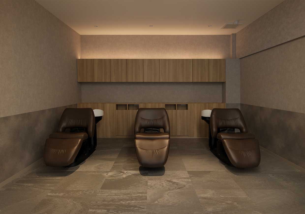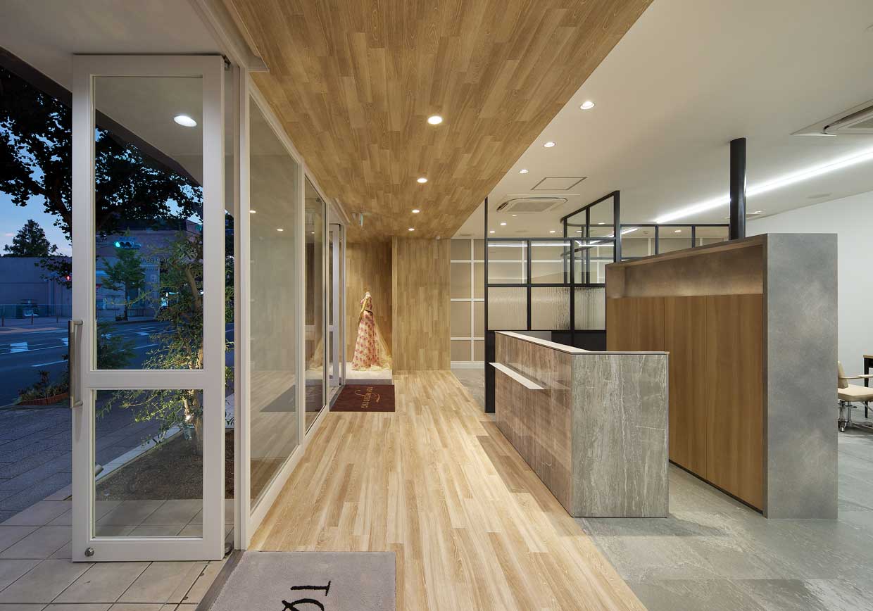 ヘアサロンだけでなくウェディングサロンも併設されているため、落ち着きと高級感のある上質な空間作りを目指した。スタイリングスペースと、シャンプー/プライベートスペースの明るさに差をつけることで、自然とON/OFFの気持ちが切り替えられるような、ライティングによる雰囲気の差別化を演出した。