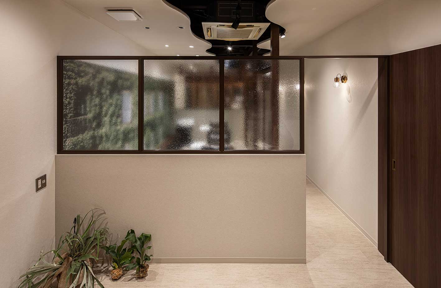 半個室の美容室へと改装。植物が生い茂るベランダがサロンの特徴。ベランダに面さない手前の2席は半個室にすることで感じる圧迫感を、壁面ビジュアルと全面ミラーにて緑を取り入れつつ開放感をもたせた。いつ来てもどの席に座っても、異なるグリーンに癒される空間となっている。