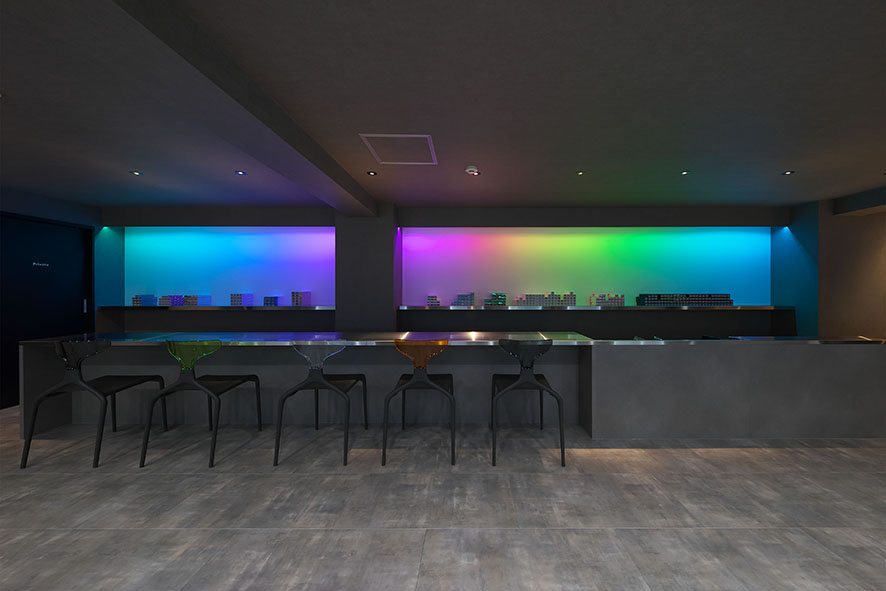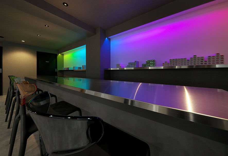 昨今、多種多様のカラーを楽しむ人が増えている中、本当に色々なカラーを提供できる店はそんなに多くない。mellではそんなカラーのニーズに応えられる数多くのカラー剤を完備しており、それに対応すべくカラーにこだわりのある人がバーに来た感覚でカラーを楽しめる空間づくりをした。