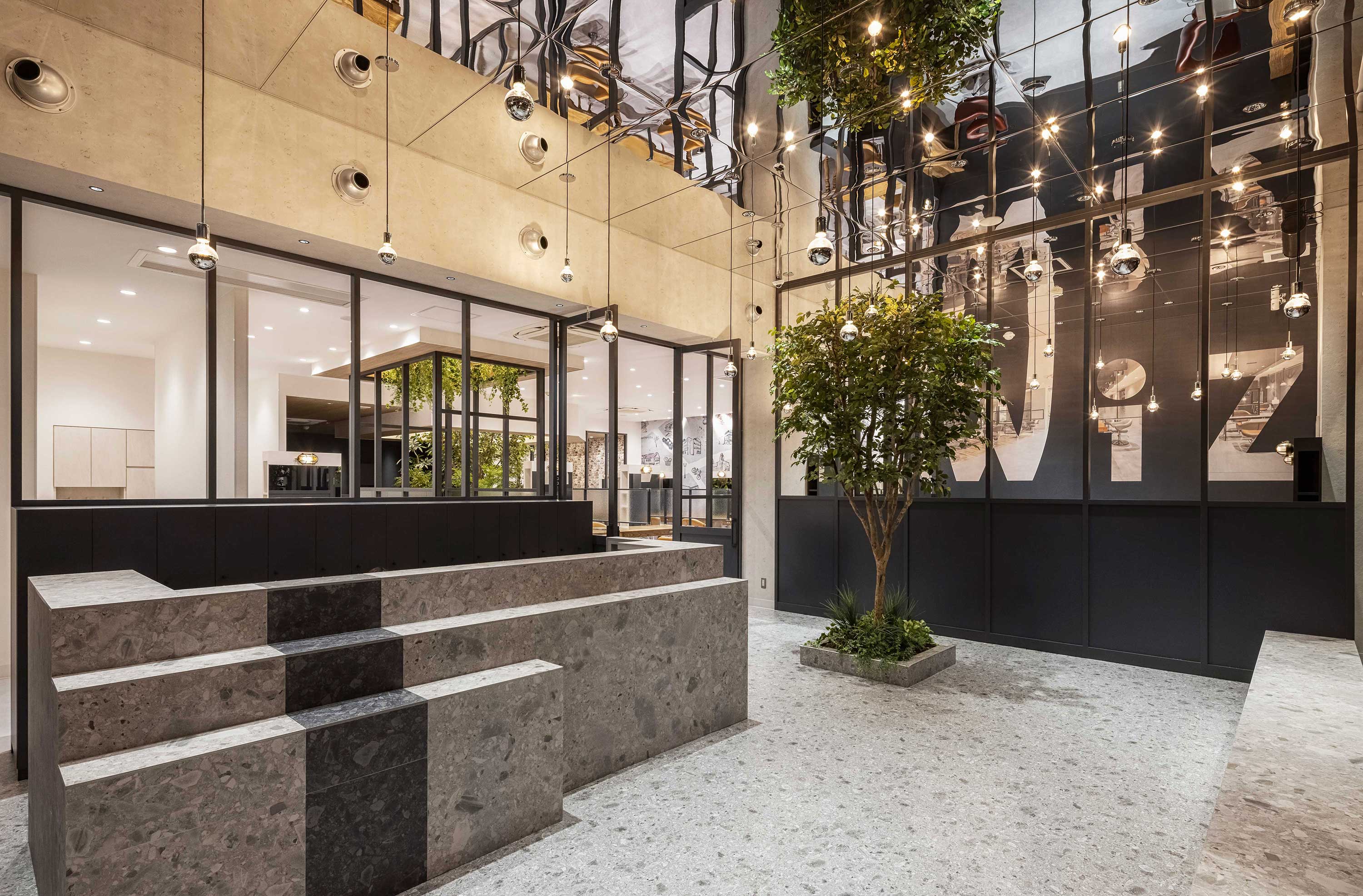 千葉県内で店舗展開するWizグループの支店出店計画。店内に外部空間を点在するちう設定をし、中庭(シャンプーキッズ)、渡り廊下(店内通路)、テラス(メンズ)、エントランス(フロント)の仮想の外部空間を設えた。中庭、渡り廊下にはグリーンを配し、内部の天井が見えないように工夫をし、テラス、エントランスには天井にアクリルミラーを貼り、突き抜けるような高さを演出した。
