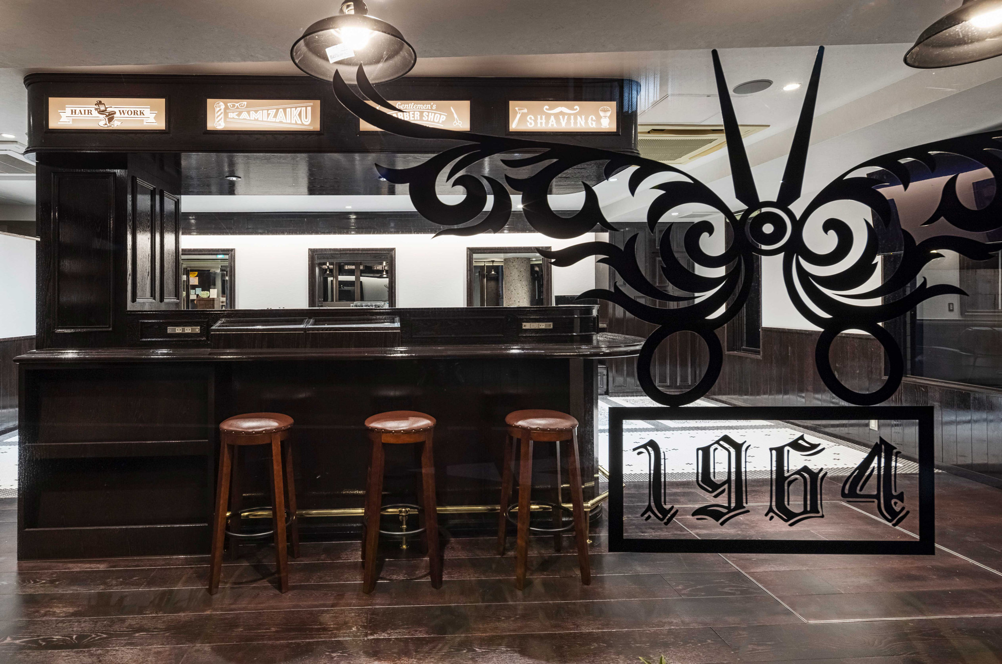 オーナーこだわりの素材を散りばめた空間は、床はデザインモザイクタイルと無垢フローリング、腰は無垢の羽目板にアンティーク調の濃いブラウン家具。センターには店の象徴となるカウンターを配し、入口部分とガラス面にはこの改装に向け考案されたハサミに羽が生えたエンブレム。それらが三位一体となり唯一無二の空間が完成した。
