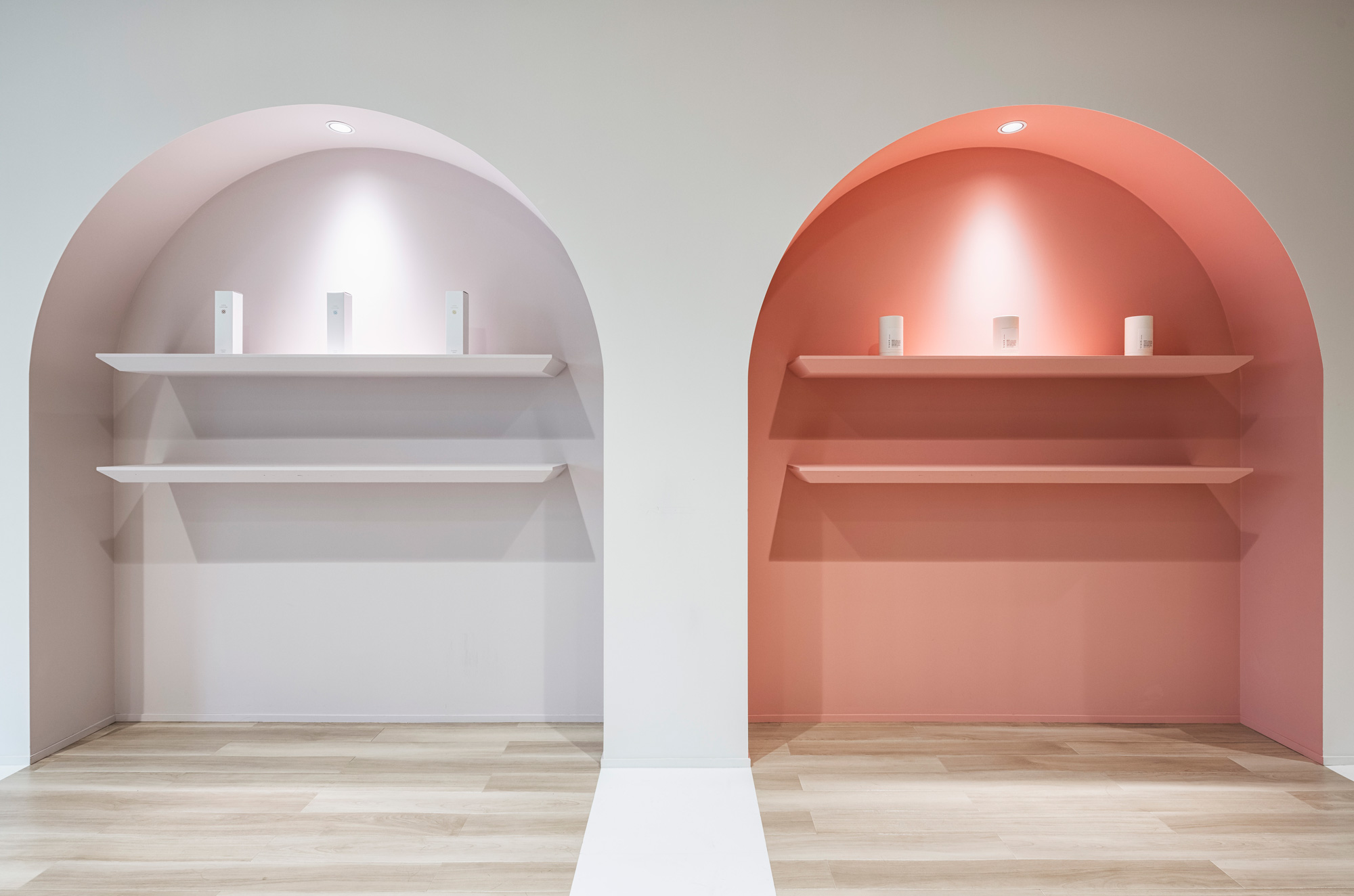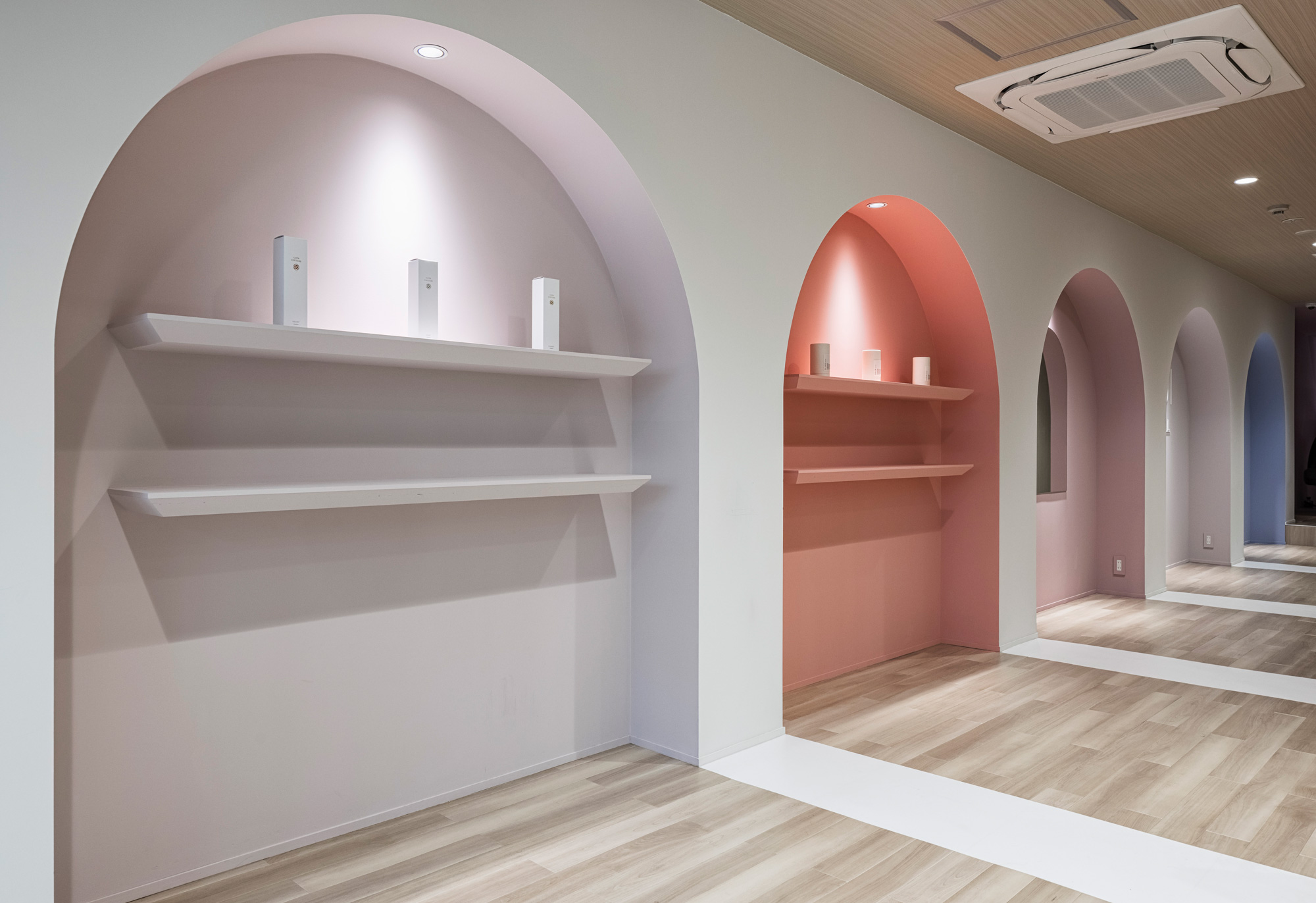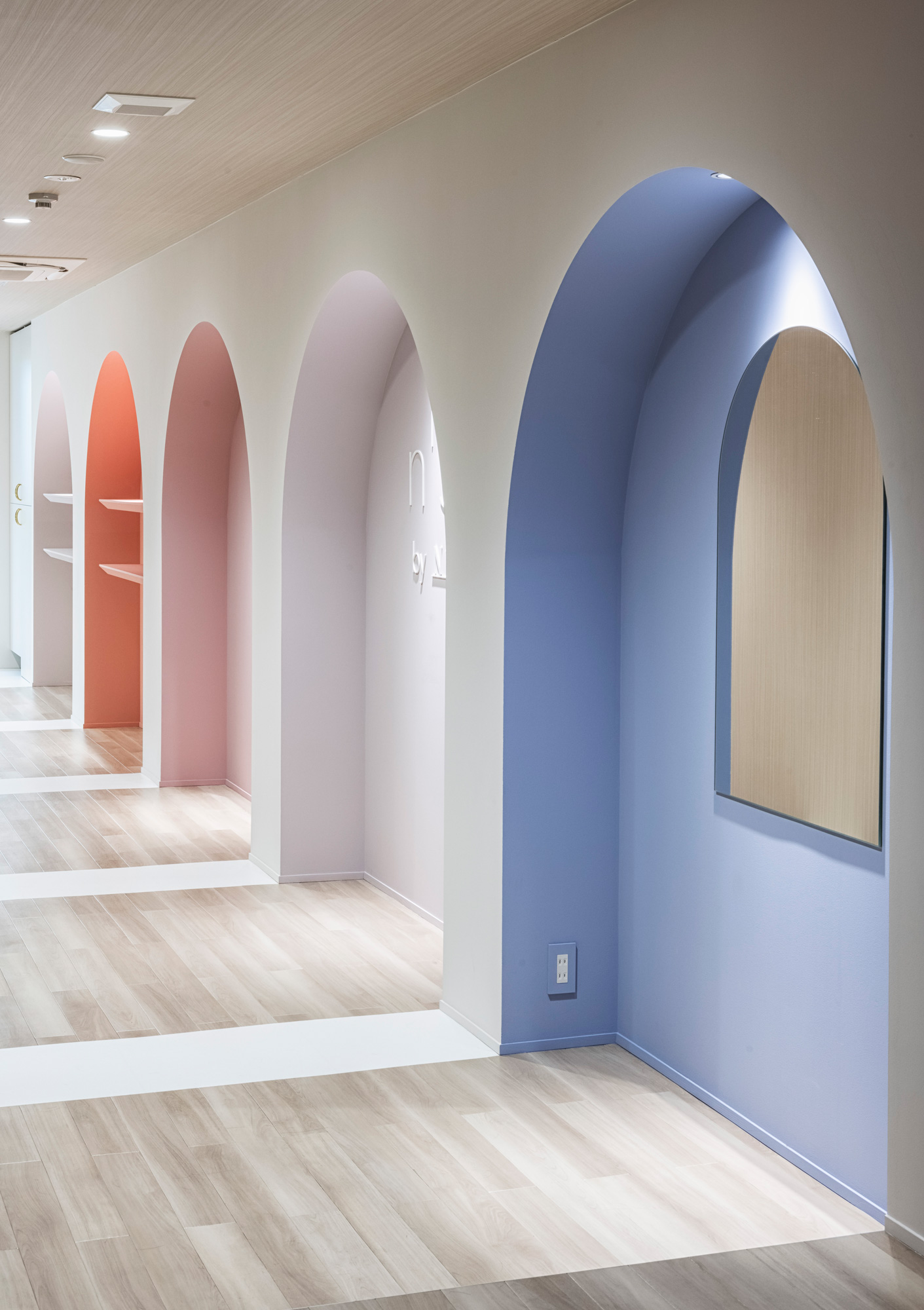 細長いという条件に対して、アーチを連続させることで奥行きを演出し、各アーチが限られたスペースの中でも待合やカウンセリングなどのちょっとした空間を生み出している。またアーチそれぞれで色味を変えることでセット面とシャンプー台の間を歩いていて楽しい体験ができる空間になるよう工夫した。